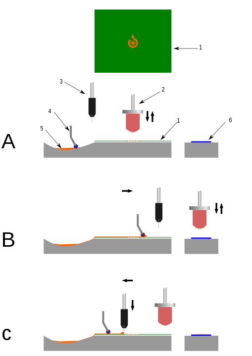 - 從起始位置開始,密封的墨杯(倒置的盛有墨水的杯子)位于印版蝕刻圖稿區域上方,覆蓋圖像并用墨水填充圖像。